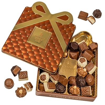Chocolate Gift Basket, Candy Food Gifts Arrangement Platter, Gourmet Snack Gift Bow Tin Box, Present Idea, Corporate Him & Her, Men, Women, Family- Gourmet Belgian Truffles- Brown- Bonnie & Pop